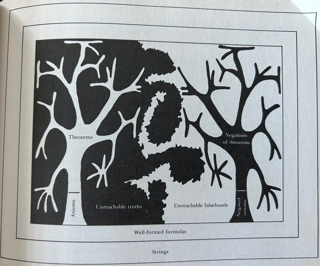 We are made up of the inanimate organic material, yet we come to a self in this. It’s beautiful when you think about it. But trying to explain it is trying to prove a paradox. We can pick an axiom and devise a bunch of theorems to prove that train of thought. But eventually, we reach the limits of these axioms. Humans don’t need to be locked into that train of thought. And so, we step outside only to step into the next set of assumptions. There are unreachable truths, unreachable falsehoods. With every theorem, we can prove there is a negation of it. With every axiom, there is a counter place to start.